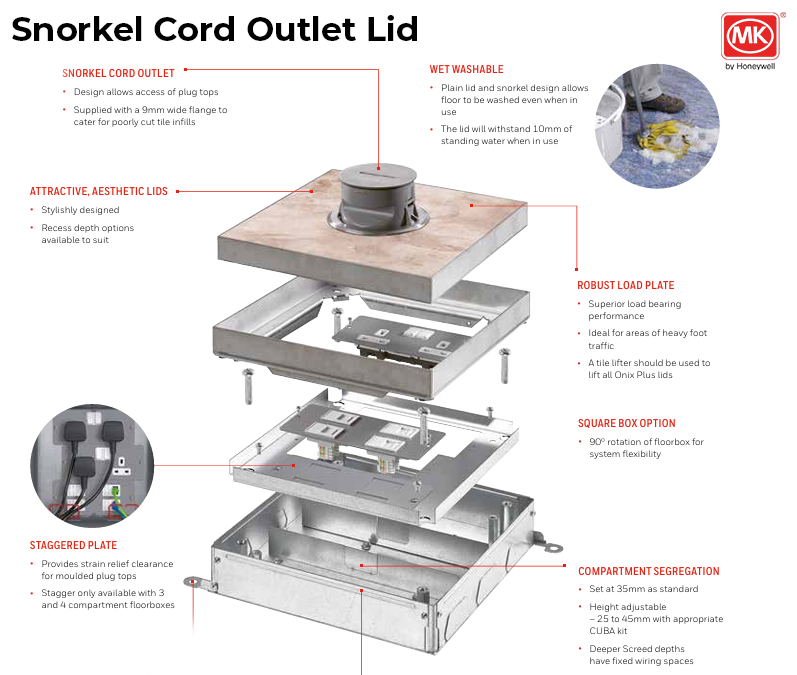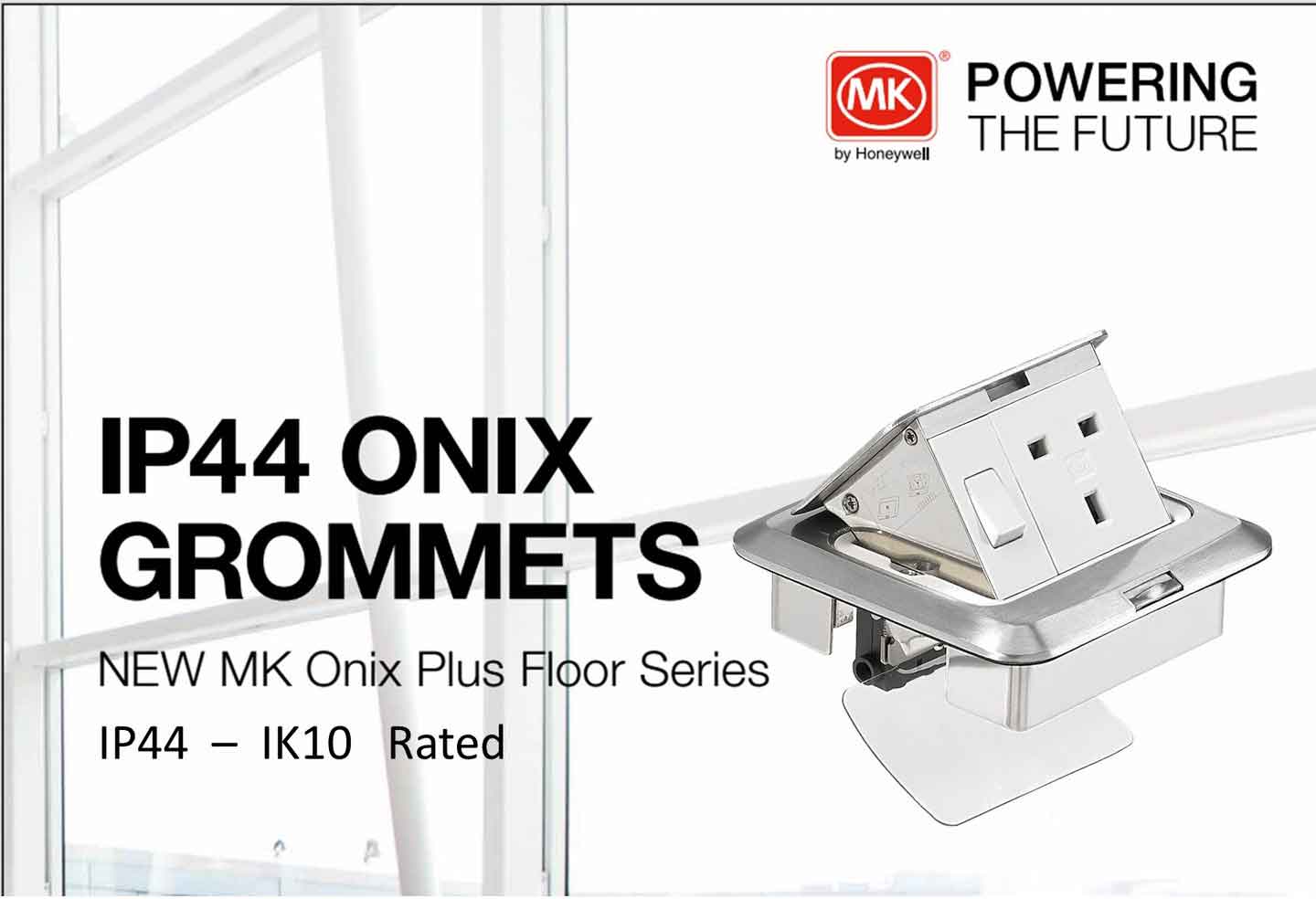 IP44 Onix Grommets is the new addition to the MK Onix Plus Floor Series, a unique, innovative solution to power and data distribution requirements in screed floors, desk and raised floor applications.